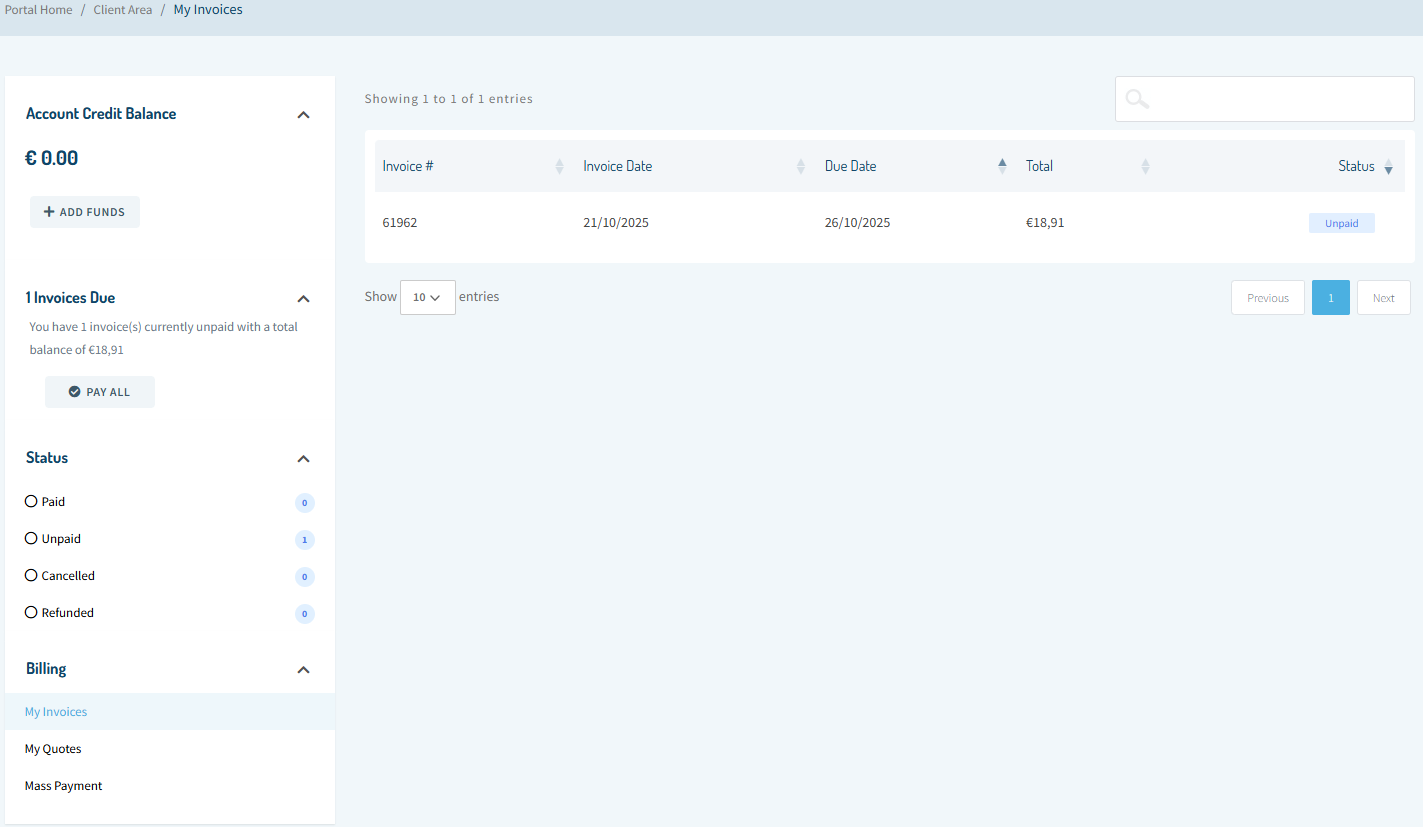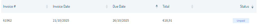 In the My Invoices section, you can view a complete list of your invoices, categorized by status (paid or unpaid).