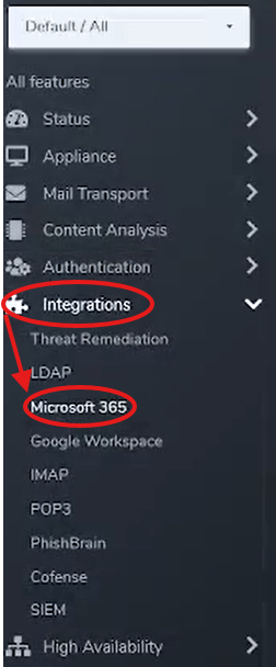 12. From the left menu, go to Integrations and select Microsoft 365.