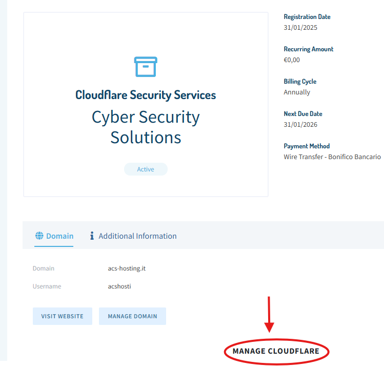 Scroll down the page and click on Manage Cloudflare to access the management interface.