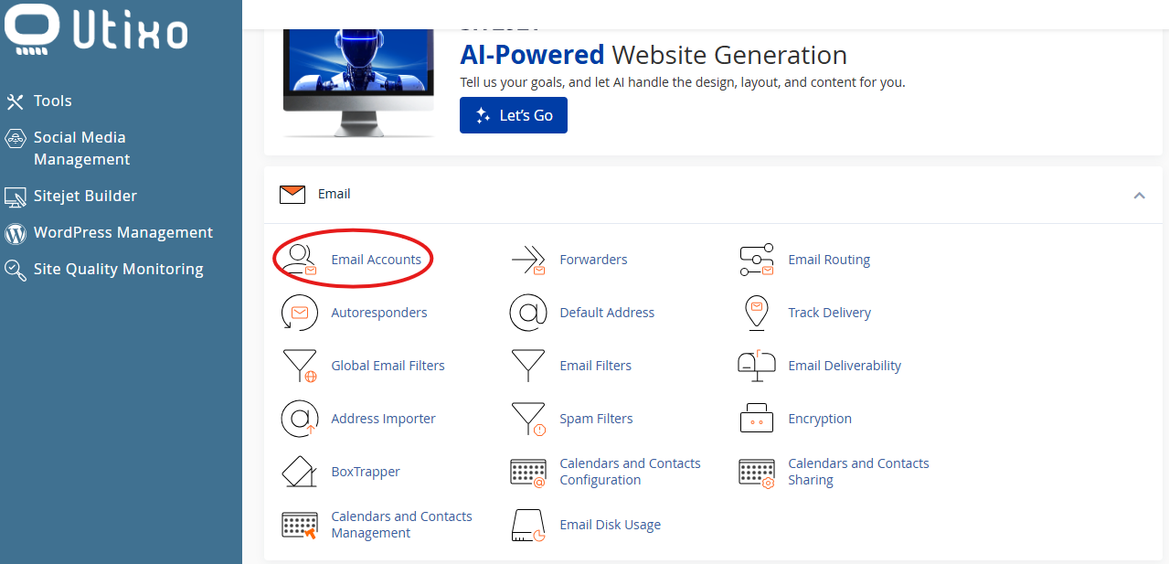 Once inside the dashboard, scroll to the Email section and click on Email Accounts.