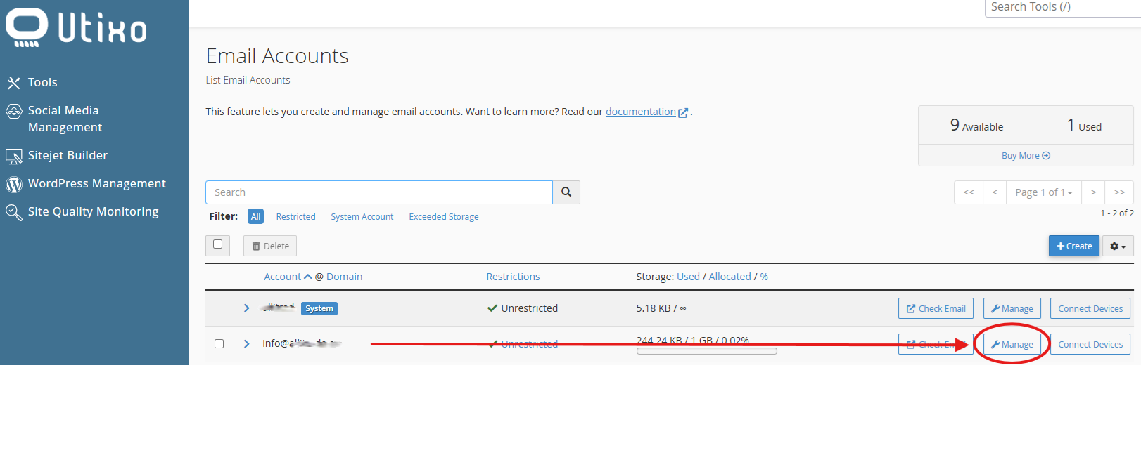 Locate the email address for which you want to change the password, then click on Manage.