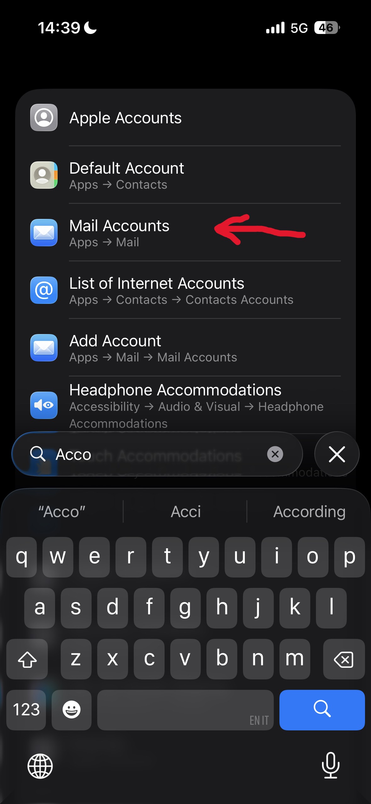 Open the Settings app on your iPhone, scroll down or use the search bar to find Mail, then select Accounts.