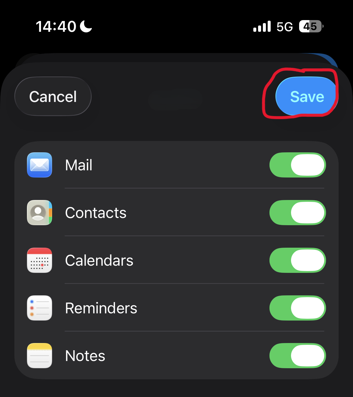 Finally, make sure all desired services (mail, contacts, calendars, etc.) are enabled, then tap Save to complete the configuration.